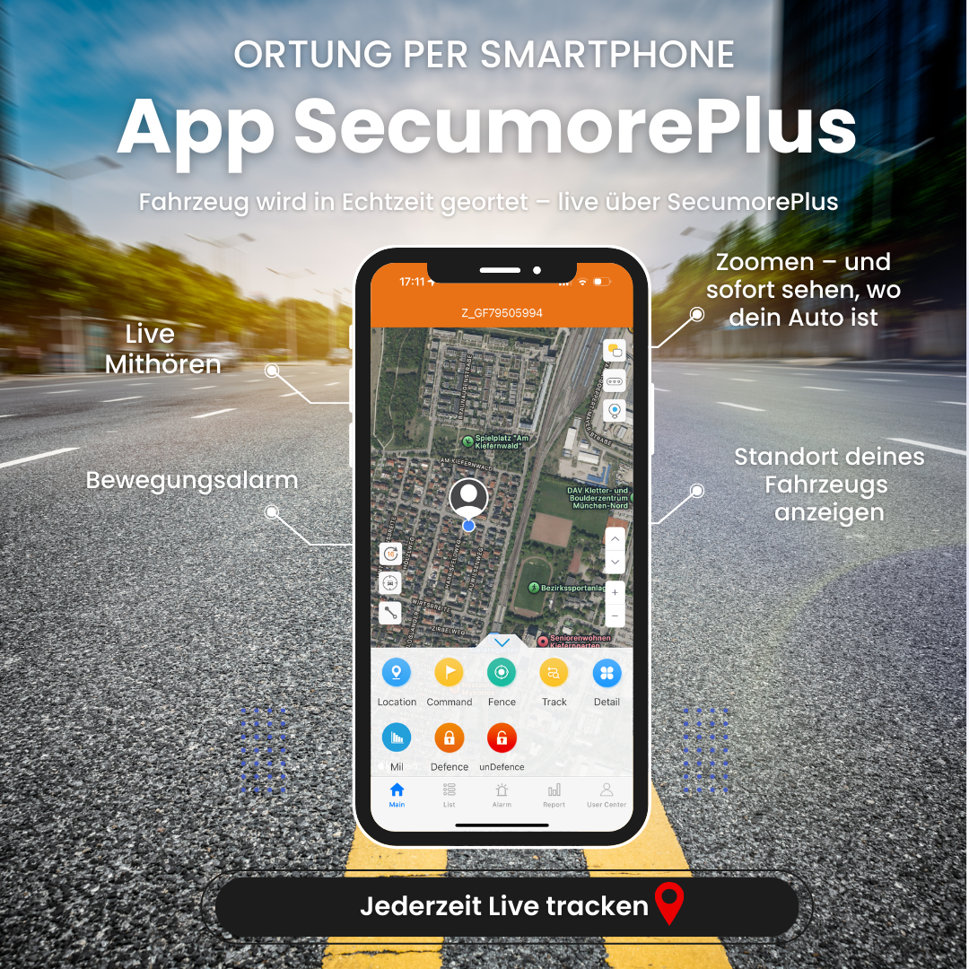 Mit TrackTok hast du dein Fahrzeug jederzeit im Blick: Verfolge den Standort in Echtzeit, höre live mit und erhalte sofort einen Alarm, wenn dein Auto unbefugt bewegt wird – alles ganz einfach über die SecumorePlus-App.